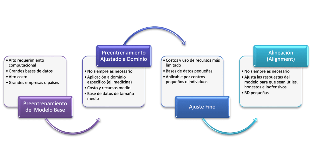 3. Ajuste fino (Fine Tuning): Se trata de ajustar y adaptar un modelo preentrenado para que realice tareas específicas o se adapte mejor a un ámbito concreto. Para ello, suele ser necesario entrenar el modelo en un conjunto de datos más pequeño y específico que sea relevante para la tarea o el tema deseados. El ajuste fino aprovecha este conocimiento general adquirido durante el preentrenamiento y refina el modelo para lograr un mejor rendimiento y comprensión en un dominio específico (6. Dilmegani). Se requiere que los ejemplos de entrenamiento sean presentados de la manera como se requiere que el modelo genere las respuestas, por lo tanto es una fase de aprendizaje supervisado.