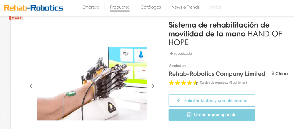 Figura. Ejemplo de sistema de rehabilitación de la mano (https://www.rehab-robotics.com.hk/hoh/hoh_basic.html).